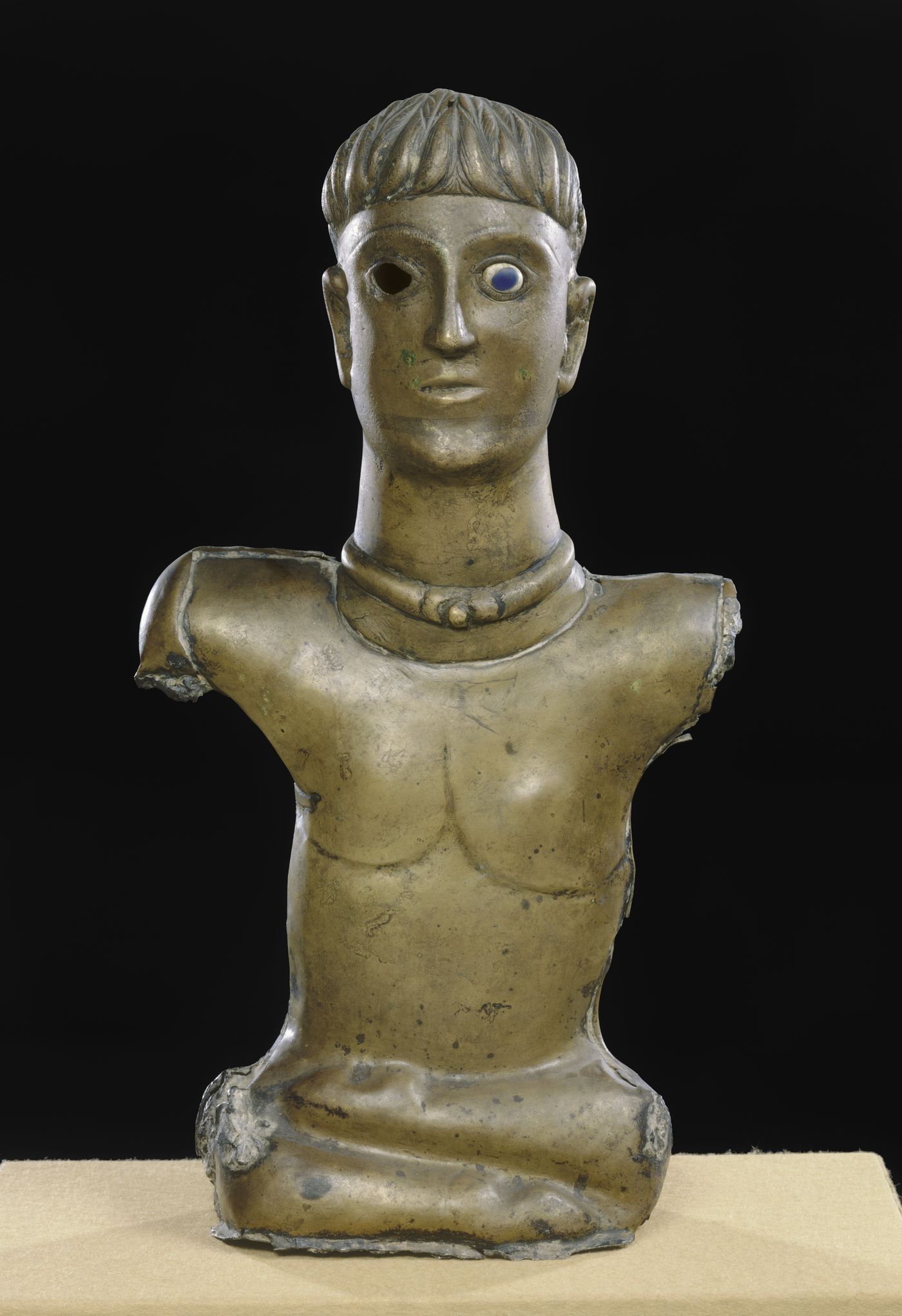 Ce personnage masculin assis en tailleur, nu et paré d’un torque détail b, représente peut-être un héros, un ancêtre ou une divinité gauloise. Dès l’époque gauloise ancienne, au VIe siècle avant J.-C., le torque image 1 signale un être exceptionnel. Parfois retrouvé dans des tombes, souvent représenté dans la statuaire image 2, il est associé au pouvoir et au monde divin. La posture assise en tailleur est également typiquement gauloise, c’est celle des héros ou des ancêtres divinisés image 3 image 4.