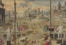 Hubert Robert, surnommé « Robert des Ruines », fit de ce type de visions architecturales une véritable spécialité. Formé à Rome, où il séjourne de 1754 à 1765, il y découvre les trésors de l’Antiquité et les paysages urbains mêlés de fragments archéologiques. Il étudie les maîtres italiens. Revenu en France, il représente aussi bien les monuments romains que les vestiges français, mais également des ruines imaginaires conçues avec fantaisie. Académicien, proche des cercles de collectionneurs et de mécènes, il incarne une sensibilité nouvelle : celle où la ruine n’est pas seulement le témoignage d’un passé, mais aussi une vision poétique.