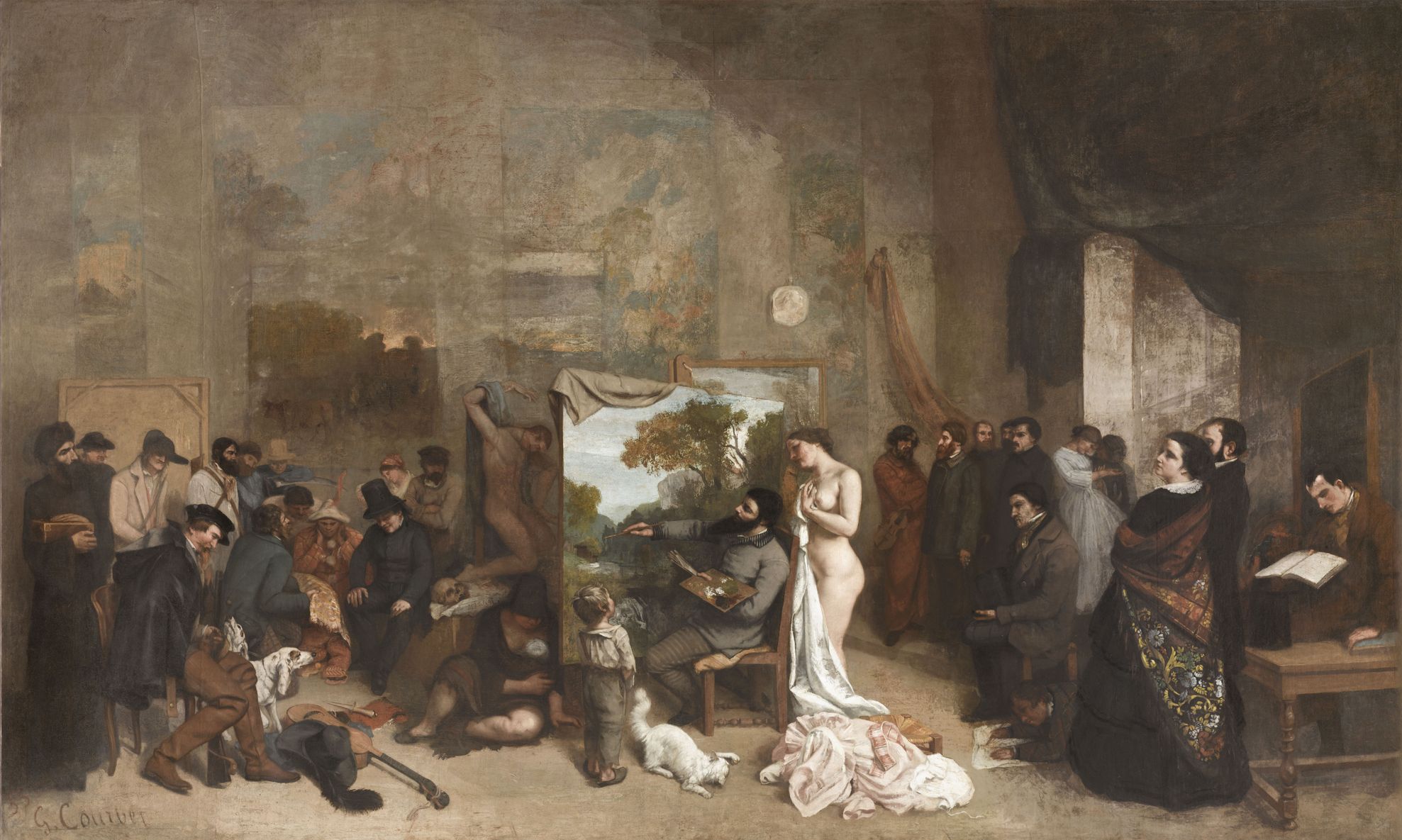 Les personnages et accessoires autour du peintre semblent être une projection visuelle de sa mémoire. Courbet indique, dans une lettre de l’automne 1854 à son ami Champfleury, critique d’art, ce que son tableau représente : « C’est l’histoire morale et physique de mon atelier. Première partie : ce sont les gens qui me servent, me soutiennent dans mon idée et participent à mon action. Ce sont les gens qui vivent de la vie, qui vivent de la mort. C’est la société dans son haut, dans son bas, dans son milieu. En un mot, c’est ma manière de voir la société dans ses intérêts et ses passions. C’est le monde qui vient se faire peindre chez moi. »