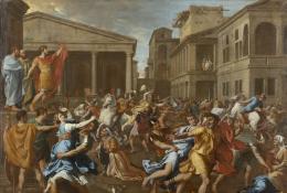 Dans ce tableau en trois panneaux image principale, de multiples personnages s’animent dans un décor monumental inspiré de l’Antique qui les domine. La violence qui s’y déchaîne évoque les massacres qui jalonnent l'histoire.