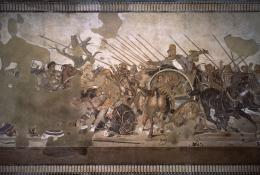 L’œuvre du Louvre est la mieux conservée des trois. On peut encore y voir les feuilles d’argent appliquées sur les cuirasses et les pastilles dorées ornant les harnachements des chevaux détail b. Cet effet de brillance accentuait le réalisme, rendant plus vivante l’action représentée.